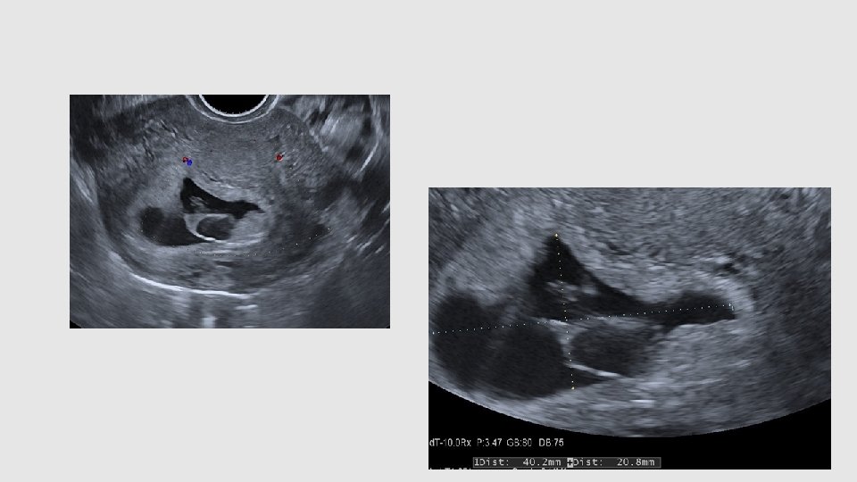 Me B-R. Contrôle clinique RAS Cs 5 semaines après pour douleurs et nausées HCG 615 ui il y a 3 j Corps jaune hemgq Endomètre épaissi Image anéchogène