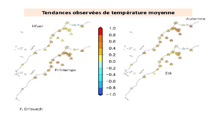 Produits et services climatiques Scénarios de changement climatique • Fourniture de scénarios climatiques futurs à différentes échelles de temps (à moyen, à moyen et à long terme) à la fois sur le Maroc et même dans des zones plus vastes (région de NA, région arabe); • Production d'informations climatiques détaillées sur les changements futurs à haute résolution à l'aide de la réduction de l'échelle dynamique et statistique; • Évaluation des changements futurs basés sur différents scénarios d'émission (RCP 2. 6, RCP 4. 5, RCP 8. 5. . . ) et pour différents horizons (par exemple: 2030, 2050, 2100. . . ). Future changes of the annual mean temperature under RCP 8. 5 for the horizon 2050 (2036 -2065 compared to 1971 -2000) issued from the high resolution climate model (ALADIN-CLIMAT) Future changes of the annual mean minimum temperature under RCP 4. 5 for the horizon 2050 (20362065 compared to 1971 -2000) issued from the high resolution climate model (ALADIN-CLIMAT)