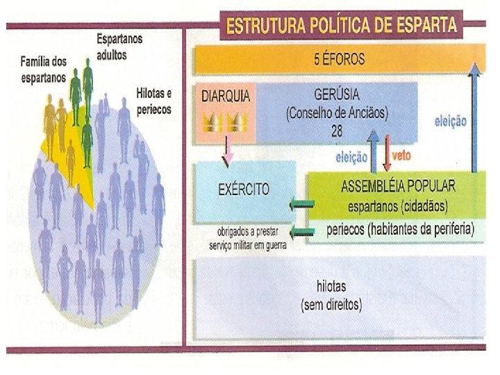 Política em ESPARTA 1. Sistema Oligárquico. 2. O governo era Diarquia (dois Reis). 3. A Assembleia (Ápela) era formada por espartanos com mais de 30 anos. 4. A Ápela era responsável pela eleição da Gerúsia e do eforato. 5. A gerúsia, formada por 28 espartanos com mais de 60 anos, tinha atribuições legislativas e judiciárias. 6. Os cinco éforos tinham funções. 7. Os Reis tinham funções religiosas e militares