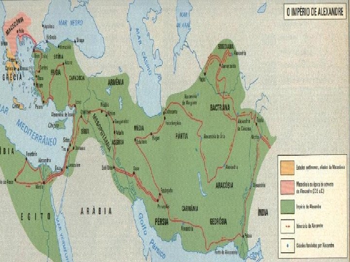 A Macedônia • A Macedônia, pequena faixa de terra, situava-se no Norte da Grécia e era habitada por povos descendentes dos primitivos gregos. Viviam da agricultura do pastoreio. • A modernização da Macedônia começou com o rei Filipe II. Após uma série de reformas internas, conhecendo as rivalidades existentes entre os Estados Gregos, iniciou a conquista da Grécia. Em 338 a. C. , Filipe venceu os gregos na Batalha da Queronéia. Morreu dois anos mais tarde, em 336 a. C.
