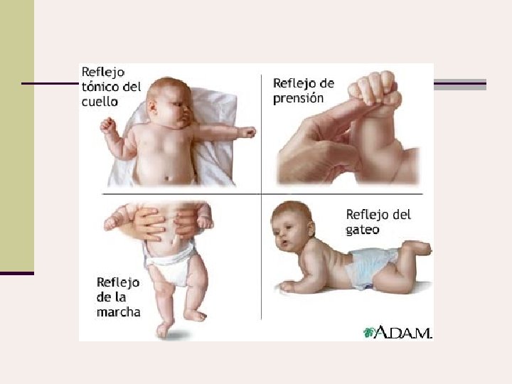 Reflejos n La actividad refleja comienza en la vida intrauterina. n La actividad del RN es eminentemente refleja, siendo la movilidad espontánea escasa. n El RN tiene una serie de reflejos, llamados reflejos arcaicos o de inmadurez, que van desapareciendo cuando el niño logra la madurez que le permite realizar la acción en forma voluntaria. Su persistencia hace sospechar retraso cortical o lesión del SNC.