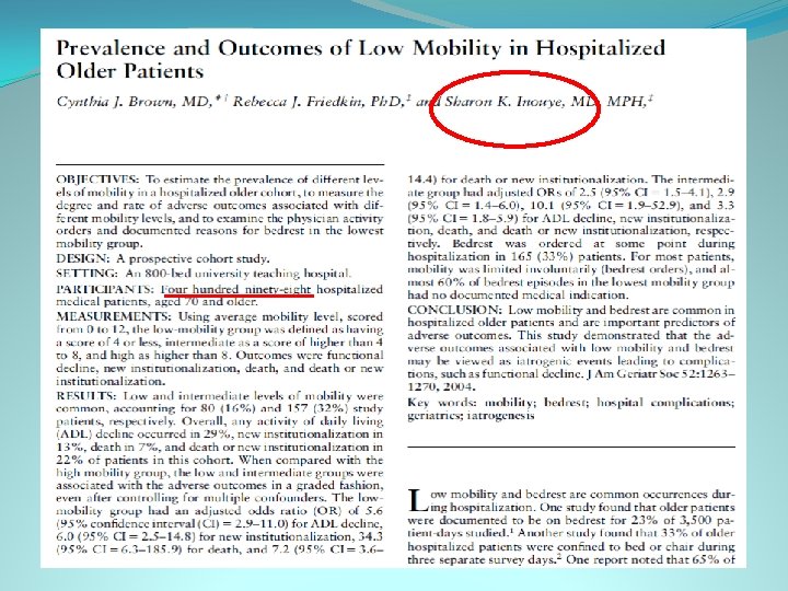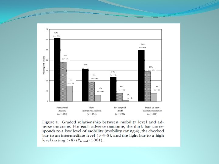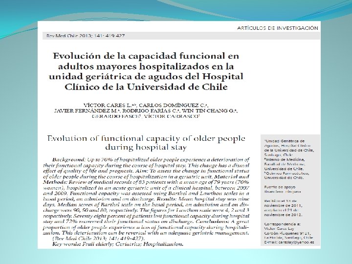 ESTUDIOS OBSERVACIONALES � 34 -50% de los ancianos hospitalizados presentan un deterioro funcional (Hirsch et al, 1990) � 30% experimenta deterioro funcional no relacionado a su diagnóstico primario (Gillik et al, 1982) � � Sólo el 50% se ha recuperado a 3 meses desde el alta (Sager et al, 1996) 16% se vuelve dependiente para caminar y 30% continúa siendo dependiente a los 3 meses (Mahoney et al, 1998)