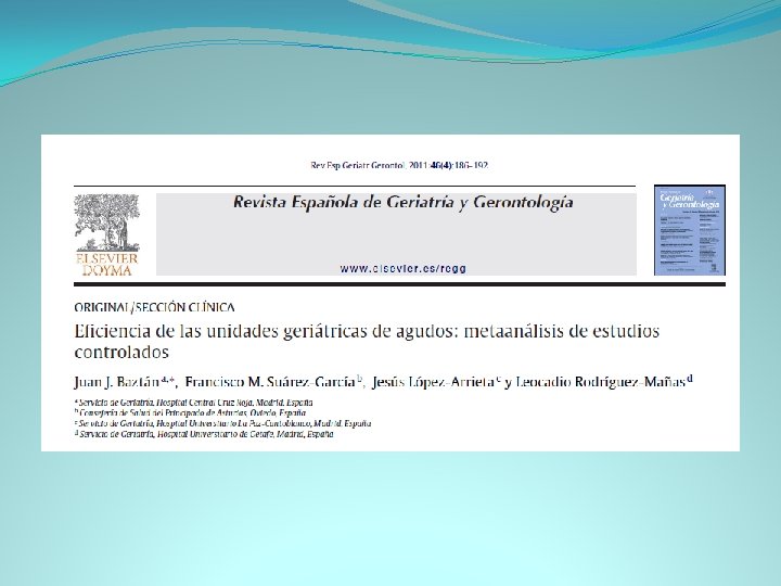 Con respecto a la Institucionalización … �Estrecha relación entre hospitalización y mal resultado �Alto costo familiar, social y financiero. �Reducción significativa en UGA Rubenstein 1984 ; Hendriksen 1984 ; Landefeld 1995 ; Reuben 1992