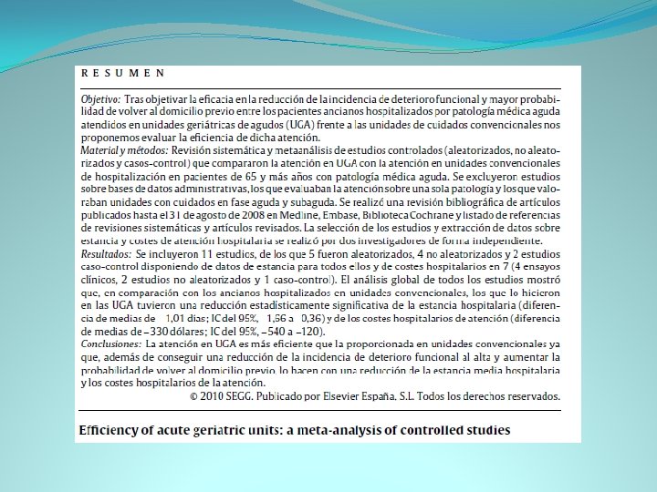 RESULTADOS LANDEFELD A LOS TRES MESES � Mortalidad 14% � ABVD e independencia 4. 0 � Mortalidad 13% � AVBD e independencia 3. 8 � AIVD e independencia 3. 9 � AIVD e independencia 3. 8 � Ingreso a unidades de larga estancia 9% � Ingreso a unidades de larga estancia 10% � Reingreso a agudos 34% � Reingreso a agudos 36% � Cuidados especializados domiciliarios 52% � Cuidados especializados domiciliarios 48%