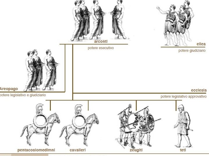 Σόλων • 594 nominato arbitro e legislatore – arconte dal • σεισάχϑεια: abolizione della schiavitù per debiti e cancellazione delle ipoteche sulle proprietà terriere – restituzione delle terre ai vecchi proprietari • costituzione timocratica a base latifondistica – – pentacosiomedimni cavalieri zeugiti teti 500 medimni di cereali 300 medimni 200 medimni meno di 200 medimni • esclusi: donne, commercianti