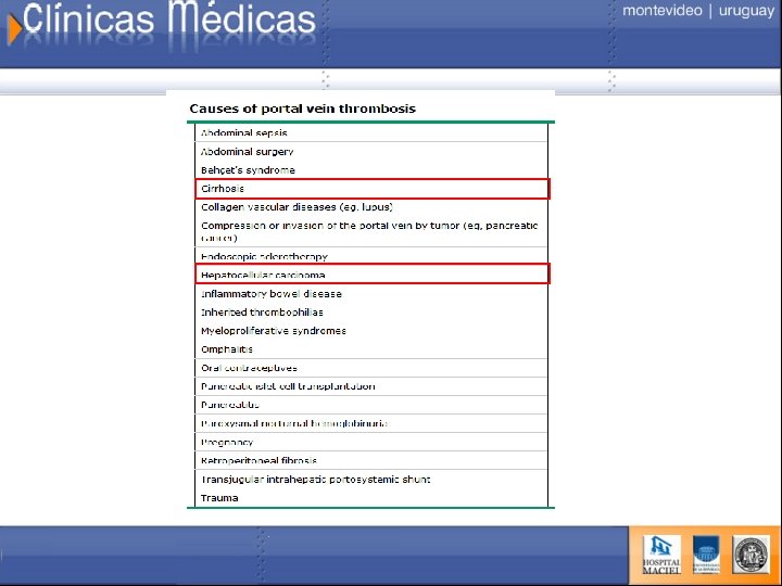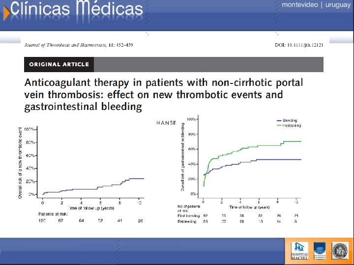 Bibliografia 1) Seijo. S, García- Criado. A, Darnell. A, García. J. Diagnóstico y tratamiento de la trombosis portal en la cirrosis hepática. Gastroenterología y Hepatología. 2012: 35(9): 660 -666. 2) Vladareanu. AM , Popov. V, Bumbea. H , Onisai. M, Ilea. A, Dobrea. C , et al. Splanchnic vein thrombosis, the onset manifestation in JAK positive Chronic Myeloproliferative Disorders Neoplasms. J Med Life. 2011 Feb 15; 4(1): 97– 101. 3) Arun J Sanyal, MD. Chronic portal vein thrombosis in adults: Clinical manifestations, diagnosis, and management. Sep 18, 2014. Disponible en: http: //www. uptodate. com/contents/chronic-portal-vein-thrombosis-in-adults-clinicalmanifestations-diagnosis-and-management? source=search_result&search=trombosis+porta&selected. Title=2~98 4) Seijo. S, García. J. Enfermedades vasculares hepáticas. Laboratorio de hemodinamia hepática. Unidad de hepatología. Hospital clínico, Barcelona. Hígado: 59: 853 -865. Disponible en http: //www. aegastro. es/sites/default/files/archivos/ayudas-practicas/59_Enfermedades_vasculares_hepaticas. pdf. 5) Seijio S, García J. Trombosis portal. Gastroenterol Hepatol. 2010; 33(3): 179– 190 6) Condat B, Pessione F, Hillaire S, Denninger MH, Guillin MC, Poliquin M. Current outcome of portal vein thrombosis in adults: Risk and benefit of anticoagulant therapy. Gastroenterology. 2001; 120: 490 -497 7) Spaander M, Hoekstra J, Hansen BE, van Buuren HR, Leebeek F, Janssen H. Anticoagulant therapy in patients with non-cirrotic portal vein thrombosis: effect on new thrombotic events and gastrointestinal bleeding. J Thromb Haemost 2013; 11: 452 -459 8) Hoekstra J, Bresser E, Smalberg J, Spaander M, Leebeek F, Janssen H. Long-term follow-up of patients with portal vein thrombosis and myeloproliferative neoplasm. J Tromb Haemost 2011; 9: 2208 -14