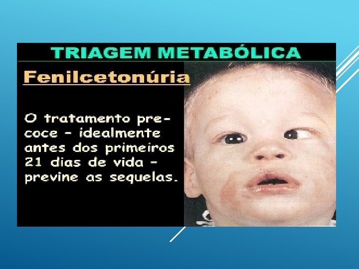 FENILCETONÚRIA (PKU) ▪ Doença genética autossômica recessiva decorrente da deficiência da enzima fenilalanina-hidroxilase, que tem a função de metabolizar a fenilalanina encontrada nas proteínas (também presente no leite) o que pode causar danos neurológicos ao bebê, causando doença mental grave; ▪ Sem a instituição do diagnóstico precoce e do tratamento antes dos 3 meses de vida, a criança apresenta um quadro clínico clássico, caracterizado por atraso global do desenvolvimento neuropsicomotor (DNPM), deficiência mental, comportamento agitado ou padrão autista, convulsões, alterações eletroencefalográficas e odor característico na urina; ▪ O tratamento preconizado deverá ser mantido por toda a vida. A dieta utilizada é hipoproteica, suplementada por uma fórmula de aminoácidos isenta de Fenilalanina (FAL), fornecida aos pacientes pelos Estados e Distrito Federal;