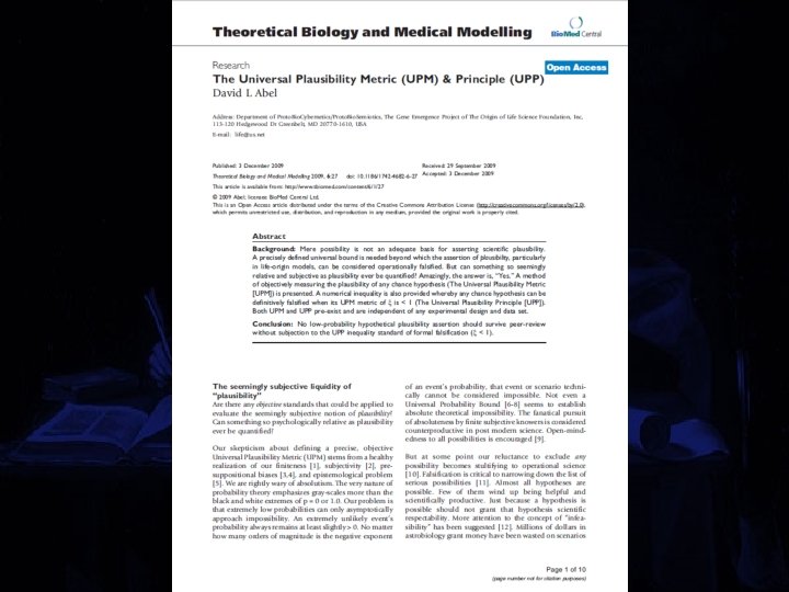 Background Many atheists claim that if something is possible, it should be considered as having a basis in scientific reality l Mere possibility is not an adequate basis for asserting scientific plausibility l This paper presents a method of objectively measuring the plausibility of any chance hypothesis (The Universal Plausibility Metric – UPM) l