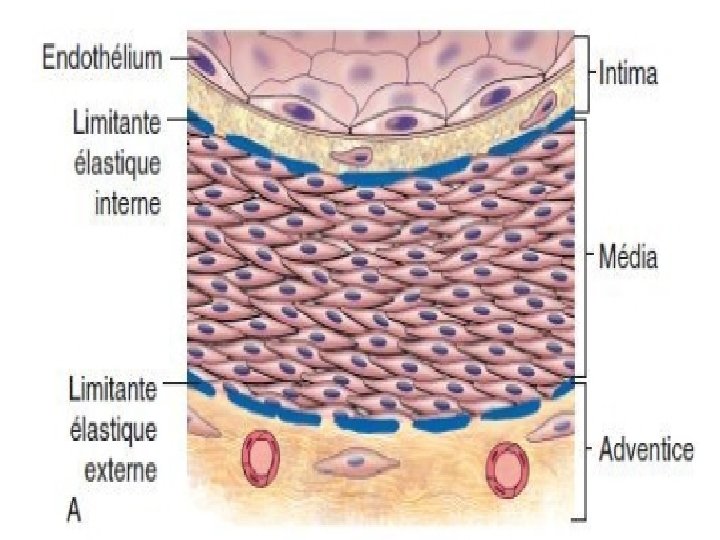 IV-1/ Rappel histologique Une paroi artèrielle est constituée de 3 couches concentriques: 1) Intima : cellules endothéliales et sous couche (matrice extracellulaire) 2) Média : cellules musculaires lisses, réseau de collagène et de mucopolysaccharides, et les limitantes élastique interne et externe 3) Adventice : tissu conjonctif peu organisé