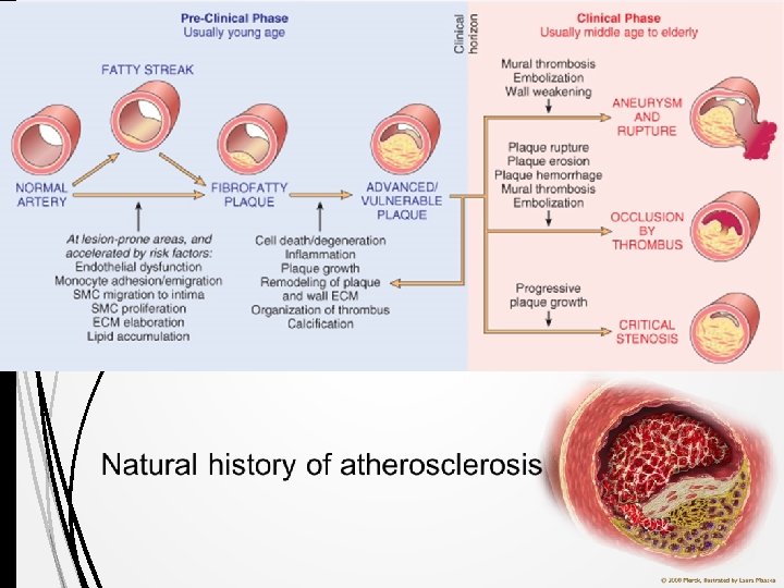PATHOLOGICAL COMPLICATIONS The advanced lesion of atherosclerosis is at risk for the following pathological changes that have clinical significance: 1) Focal rupture, ulceration, or erosion of the luminal surface of atheromatous plaques which may induce thrombus formation or discharge of debris into the bloodstream, producing microemboli composed of lesion contents (cholesterol emboli or atheroemboli). 2) Hemorrhage into a plaque (especially when atheroma in the coronary arteries) due to rupture of the overlying fibrous cap or the capillaries in the plaque. The hematoma may expand the plaque or induce plaque rupture 3) Superimposed thrombosis, the most feared complication, usually occurs on disrupted lesions (those with rupture, ulceration, erosion, or hemorrhage) the thrombus can lead to partial or completely occlusion of the lumen. The thrombus can also embolize. 4) Wall weakening with aneurysmal dilation. Atheroma can induced atrophy of the underlying media, with loss of elastic tissue, causing weakness, aneurysm and potential rupture 5) Calcifications: Atheromas often undergo calcification.