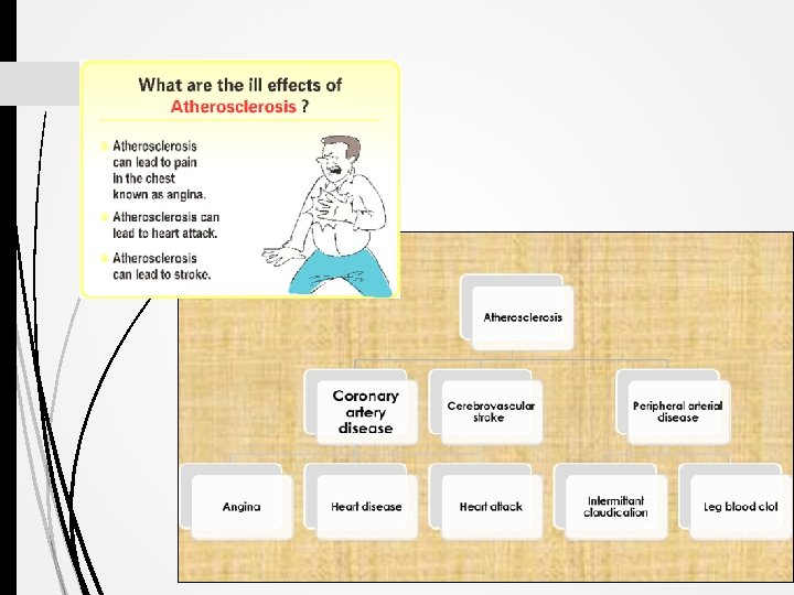 Atherosclerosis (AS) Atherosclerosis is characterized by intimal lesions called atheromas/ atheromatous/ fibrofatty plaques, which protrude into and obstruct vascular lumens and weaken the underlying media. They may lead to serious complications like Coronary artery disease (angina & MI) and Carotid atherosclerotic disease (stroke) The most heavily involved vessels are the abdominal aorta then coronary arteries, the popliteal arteries, the internal carotid arteries, and the vessels of the circle of Willis.