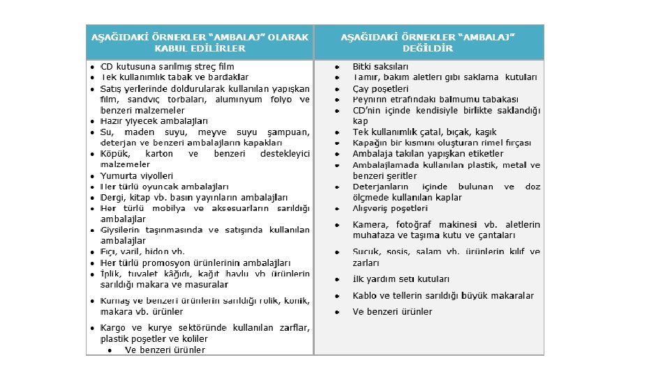 Çevre mevzuatı kapsamında çıkarılan Ambalaj Atıklarının Kontrolü Yönetmeliği uyarınca işletmeler 3 şekilde tanımlanmaktadır: - Ambalaj Üreticileri; ambalajları üretenler ve/veya ithal edenler, - Tedarikçi; kendisi ambalaj üreticisi olmayıp piyasaya sürenlere ambalaj tedarik edenler ile piyasaya sürenler adına fason üretim yapanlar, - Piyasaya Süren; Bir ürünü Ambalaj Atıklarının Kontrolü Yönetmeliği kapsamındaki ambalajlar ile paketleyen gerçek veya tüzel kişi, üretici tarafından direkt olarak piyasaya sürülmemesi durumunda ise ambalajın üzerinde adını ve/veya ticari markasını kullanan gerçek veya tüzel kişi, üreticinin Türkiye dışında olması halinde, üretici tarafından yetkilendirilen temsilci ve/veya ithalatçı olarak tanımlanmaktadır.