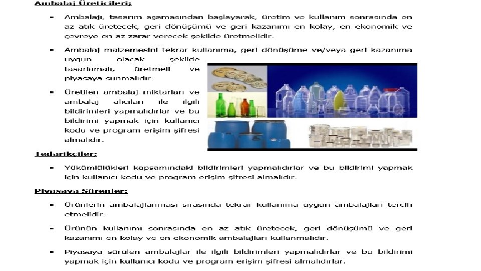 AMBALAJ ATIKLARI YÖNETİMİ Ambalaj Atıkları Yönetimi, ambalaj atıklarının belirli bir sistem içinde, kaynağında ayrı toplanması, taşınması, ayrılması, tekrar kullanılması, geri dönüştürülmesi, geri kazanılması, bertarafı ve bu tür faaliyetlerin gözetim, denetim ve izlenmesini kapsar. Kullanılan malzemeye ve oluştuğu kaynağa bakılmaksızın, tüketim sonucu oluşan ambalaj atıkları, çevre kirliliğinin azaltılması, düzenli depolama tesislerinden azami seviyede istifade edilmesi ve ekonomiye katkı sağlanması amacıyla diğer atıklardan ayrı olarak oluştukları yerlerde biriktirilmek zorundadır. Organize sanayi bölgeleri yönetimleri, organize sanayi bölgeleri bünyesinde yer alan sanayi işletmeleri ve diğer sanayi işletmeleri, çevre kirliliğine yol açmayacak şekilde ayrı biriktirilen ambalaj atıklarını oluştuğu noktada çevre lisanslı/geçici faaliyet belgeli toplama ayırma tesislerine veya istemeleri halinde belediyenin toplama sistemine bedelli ya da bedelsiz olarak verirler. Ancak lisanslı/geçici faaliyet belgeli toplama ayırma tesisi kuran organize sanayi bölge yönetimleri organize sanayi bölgeleri bünyesinde yer alan katılımcılarından ambalaj atıklarını toplayabilirler.