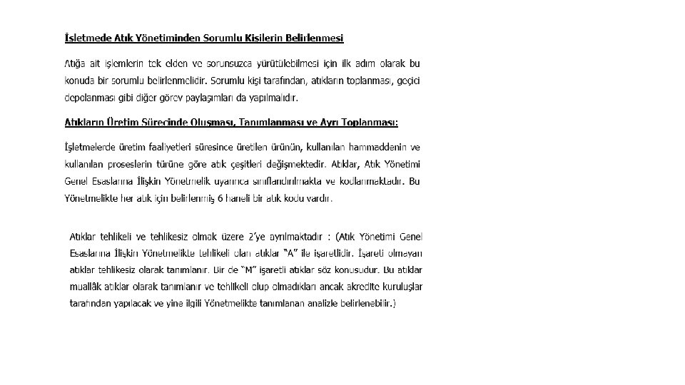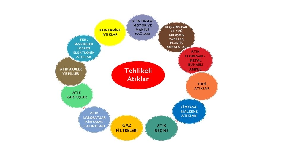 İşletmelerde Oluşabilecek Bazı Tehlikeli Atıklar: • ATIK YAĞLAR • KONTAMİNE ATIKLAR (yağ veya kimyasal malzeme bulaşmış bez, üstübü, eldiven, giysi, hava ve yağ filtresi, maske, çizme…vb. ) • ATIK AKÜLER VE PİLLER • TIBBİ ATIKLAR • BOŞ KİMYASAL VE YAĞ BULAŞMIŞ VARİLLER VE DİĞER AMBALAJLAR • TEHLİKELİ ELEKTRONİK ATIKLAR • KİMYASAL MALZEME ARTIKLARI / ATIKLARI • TEHLİKELİ ÖZELLİK GÖSTEREN ATIK REÇİNE / KUM / AKTİF KARBON VS. MALZEMELER • METALLERİN MEKANİK OLARAK İŞLENMESİ ESNASINDA OLUŞAN VE YAĞ BULAŞMIŞ ATIKLAR (YAĞLI METAL TALAŞLARI, METALİK ÇAMURLAR V. B. ) • YAĞLI ARAÇ PARÇALARI • BOYA VE VERNİK KALINTILARI • SOLVENTLER • FLORESAN LAMBALAR, METAL BUHARLI AMPULLER, KARTUŞ VE TONERLER • PESTİSİTLER • ASBEST VE DİĞER KANSEROJEN MADDELER İÇEREN ATIKLAR • FİLTRE TOZLARI • YAĞ İÇEREN KABLO ATIKLARI