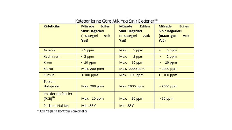 Atık Madeni Yağlar; • Herhangi bir madeni yağ veya herhangi sentetik yağ sanayide veya sanayi dışı alanlarda özellikle yağlama amacı ile belli bir süre kullanım sonucu kimyasal ve fiziksel olarak kirlenmesi ve orijinal özelliğini kaybetmesi sonucu oluşur. • Yağ, içindeki katkı maddelerinin kırılması, normal kullanım esnasında kir, metal sürtünmeleri, su veya kimyasallarla karışarak kirlenir ve rengi koyulaşarak kullanılamaz duruma gelir. • Atık madeni yağların yönetim esasları Atık Yağların Kontrolü Yönetmeliği’nde belirlenmiştir. Yönetmeliğe göre atık madeni yağlar 3 kategoriye ayrılmaktadır: • 1. Kategori Atık Yağlar: Bu kategorideki atık yağların öncelikle rejenerasyon ve rafinasyon yolu ile geri kazanımlarının sağlanması gerekmektedir. • 2. Kategori Atık Yağlar: Bu kategorideki atık yağlar Bakanlıktan lisans almış tesislerde enerji geri kazanımı amacıyla kullanıma uygun atık yağlardır. Ancak klorür, toplam halojen ve PCB parametreleri aşılmayan endüstriyel atık yağların rejenerasyon ve rafinasyon yoluyla geri kazanımı mümkündür. • 3. Kategori Atık Yağlar: Rejenerasyon ve rafinasyona uygun olmayan, yakıt olarak kullanılması insan ve çevre sağlığı açısından risk yaratan ve lisanslı tehlikeli atık yakma tesislerinde yakılarak zararsız hale getirilmesi gereken atık yağlardır.