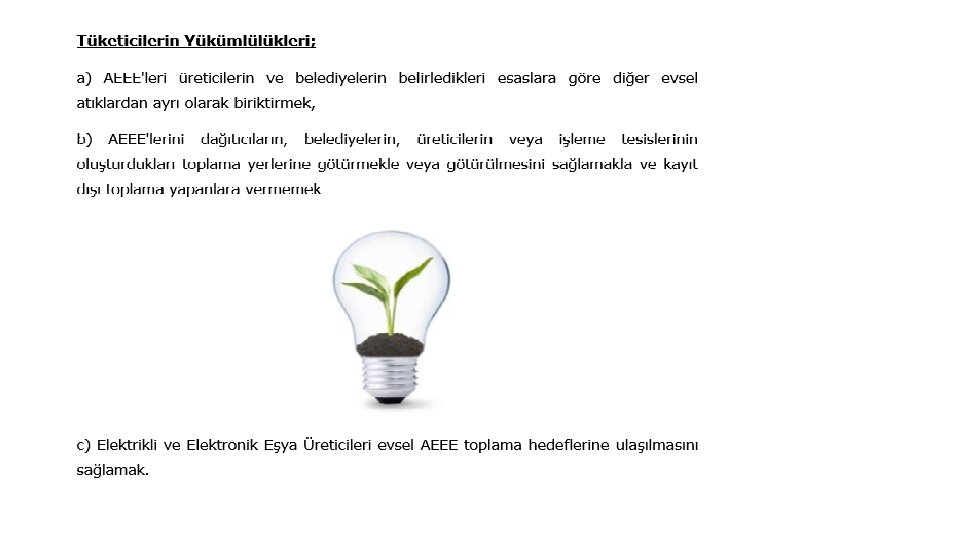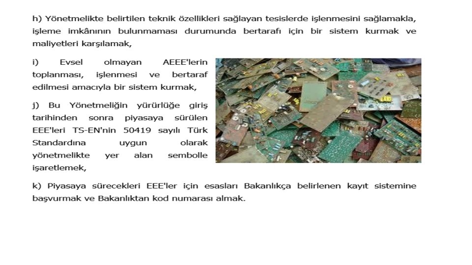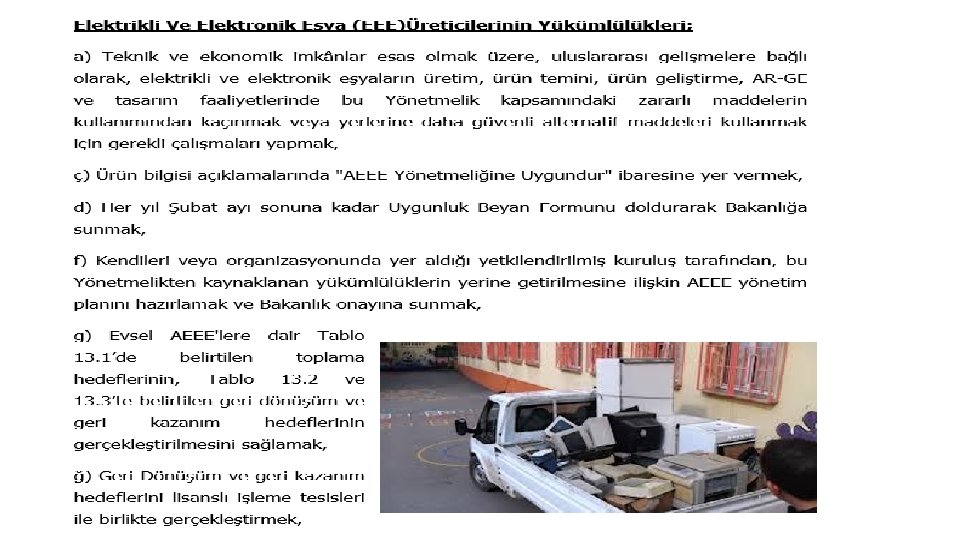 ELEKTRİKLİ VE ELEKTRONİK ATIKLARIN YÖNETİMİ İşletmeler, Atık Elektrikli Elektronik Eşyaların Kontrolü Yönetmeliği (AEEE Yönetmeliği) Resmi Gazete’de yayınlanmadan önce de tesislerinde oluşan atık elektrikli ve elektronik eşyalarını diğer atıklardan ayrı biriktirme ve Valilikten uygunluk almış tesisler vasıtasıyla geri dönüştürme veya bertaraf ettirme imkanına sahiptir. Yönetmelik yayınlandıktan sonra işletmelere bu atıkların toplanması ve bertarafı / geri dönüştürülmesi konusunda yasal bir takım yükümlülükler getirildi.