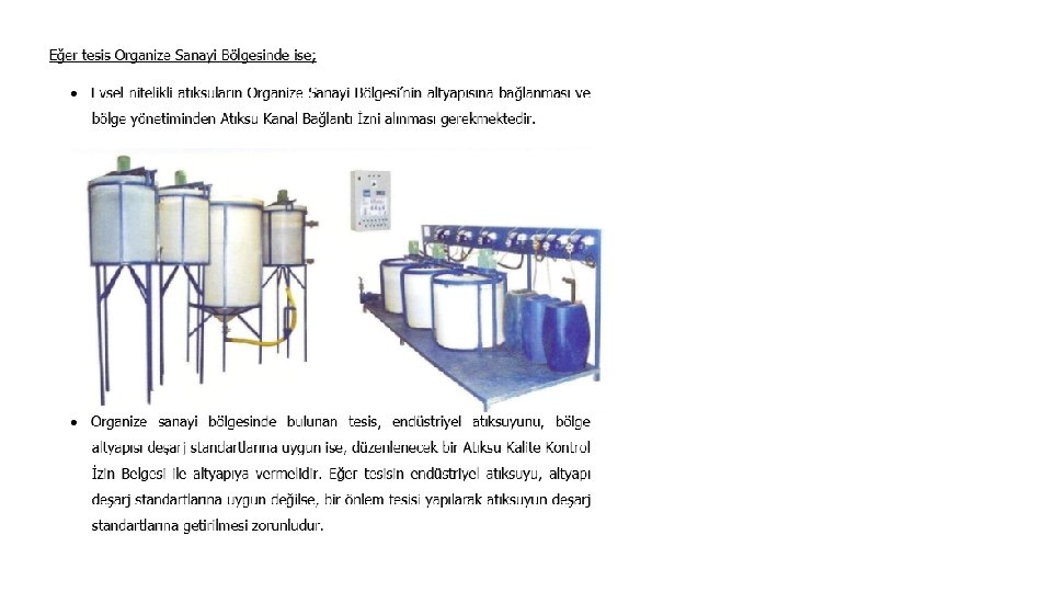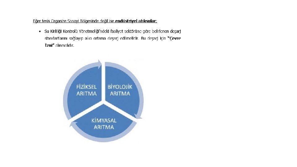 Eğer tesis Organize Sanayi bölgesinde değil ise evsel atıksular; • Kanalizasyon sistemi bulunan yerlerde her türlü atıksuyun kanalizasyon şebekesine bağlanması, ilke olarak bir hak ve mecburiyettir. Eğer tesisin atıksuyu, kanalizasyona deşarj standartlarına uygun değilse, bir önlem tesisi yapılarak atıksuyun deşarj standartlarına getirilmesi zorunludur. • Kanalizasyon yapısı bulunmayan bölgelerdeki tesislerde çalışan sayısı 84 kişiden az ise, evsel atıksular, sızdırmaz nitelikte olan bir foseptikte toplanabilir ve izinli vidanjör vasıtasıyla altyapı tesislerine verilmesi sağlanabilir. Yine bu aşamadaki yapılan protokol ve/veya vidanjöre verildiği sıradaki alınan tüm belgeleri 5 yıl süreyle saklı tutulmalıdır. Bu yöntem tercih edilmezse, arıtma tesisleri ile Yönetmelik sınır değerleri sağlanarak alıcı ortama deşarj edilebilir. Bunun için de deşarj konulu “Çevre İzni” alınması mecburidir. • Kanalizasyon yapısı bulunmayan bölgelerdeki tesislerde çalışan sayısı 84 kişiden fazla ise, evsel nitelikli atıksuların alıcı ortama deşarjı için, İl Çevre Müdürlüğü tarafından belirlenecek arıtma ve / veya bertaraf yöntemleri uygulanır. Uygulanan / uygulanacak bu yöntemler için deşarj konulu “Çevre İzni” alınmalıdır.