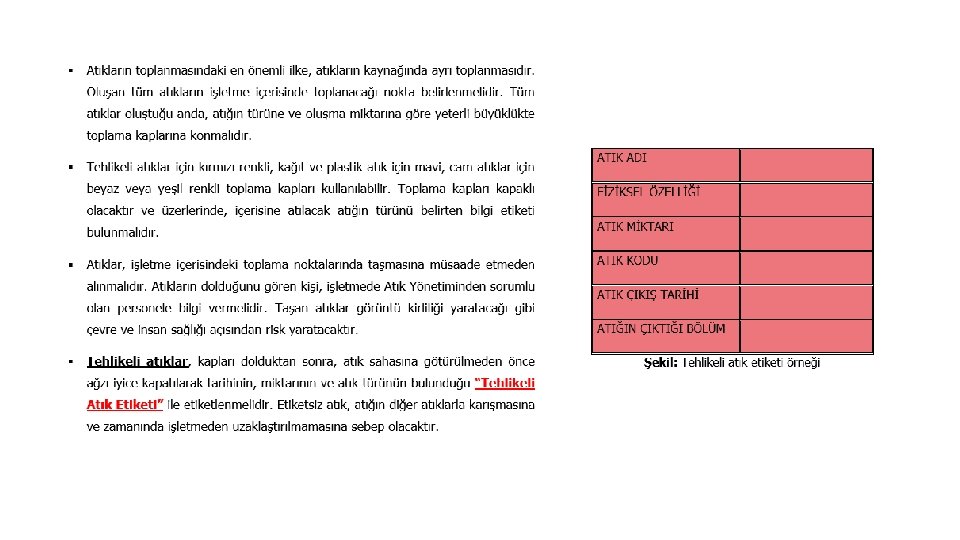 ATIKLARIN İŞLETME İÇERİSİNDE GEÇİCİ DEPOLANMASI: • Kaynağında farklı toplama kaplarında ayrı olarak toplanan tehlikeli ve tehlikesiz atıkların çevre ve insan sağlığına zarar vermeyecek ve risk oluşturmayacak şekilde depolanması için, tesis içerisinde güvenli ve mevzuata uygun şekilde bir “Geçici Atık Depolama Alanı” oluşturulmalıdır. • Eğer işletme sahası yeterli büyüklükte ise tehlikeli atıklar, ambalaj atıkları ve evsel atıklar için farklı depolama sahaları kurulması en uygun geçici depolama şeklidir. Tesis sahasının uygun olmadığı durumlarda, bir bölme ile ayrılarak birbirlerine temas etmeyecek şekilde aynı saha kullanılabilir. • Tehlikeli atıkların geçici depolanacağı alan; tesis sahası içerisinde, sızdırmaz beton zeminli (en 25 cm beton), üzeri kapalı, dökülme ve sızıntılara karşı önlem alınmış (kapalı bir rögara bağlı kör kanal veya taşma havuzu), farklı atıklar için farklı bölümler oluşturulmuş ve farklı atıkların bu bölümlerde ayrı olarak uygun şekilde (gerektiğinde toplama kapları içerisinde) depolanacağı bir alan olmalıdır. Bu alandaki bölümlerde depolanan atıkların isimleri yazılmalıdır. Bölümlere ve toplama kapları üzerine atığın kodu, türü gibi bilgiler yazılmalıdır. Bu bölüme yetkisiz kişilerin girişlerine karşı önlem alınmalıdır. Ayrıca bu sahada yangına ve acil durumlara karşı tedbir alınmalıdır. • Geçici atık depo sahasında gerekli tanımlama, uyarı ve güvenlik işaretleri bulunmalıdır ve bu işaretler temiz, okunaklı ve görülebilir olmalıdır.