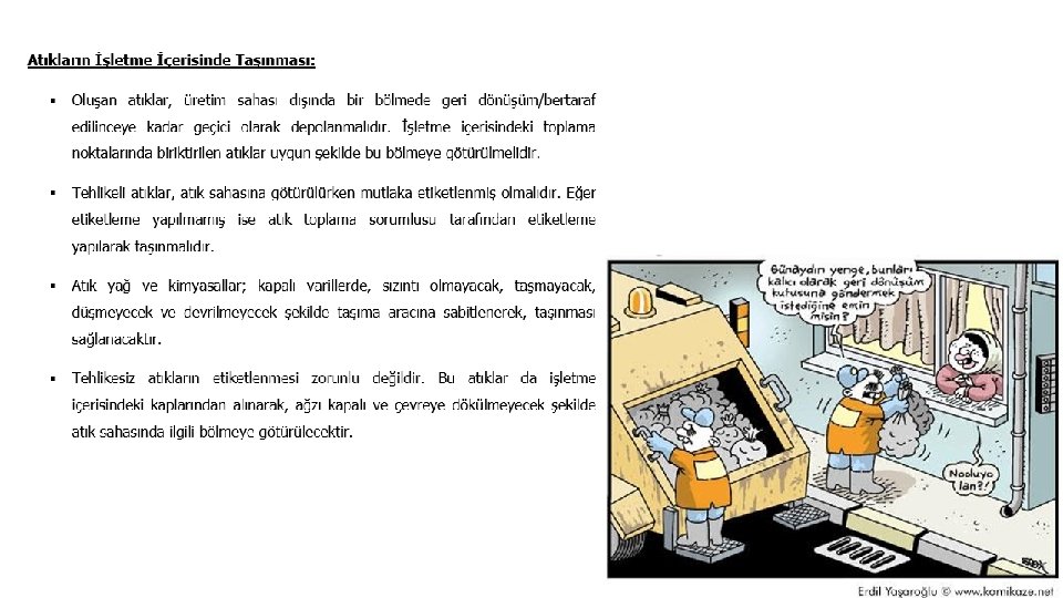 • İşletme dışına taşınan her türlü atık için, atığın özelliklerine ve miktarına uygun taşıma araçları kullanılmalıdır. Atıkların taşıma esnasında dökülmesi, taşması, sızması ve görüntü kirliliği, koku gibi problemler önlenmelidir. • Tehlikeli atıklar geri dönüşüm / bertaraf için işletme dışına taşınırken mutlaka “Lisanslı Taşıma Araçları” veya “Lisanslı Taşıma Aracı Olan Lisanslı Kuruluşlar” kullanılmalıdır. Tehlikeli atıklar lisanslı araca yüklenmeden önce lisans belgesi mutlaka istenmeli ve tüm kayıtlar en az 5 yıl muhafaza edilmelidir. • Tüm tehlikeli atıklar “Ulusal Atık Taşıma Formu” doldurularak taşınmalıdır. • Eğer tesisten gönderilecek olan tehlikeli atık miktarı 50 kg’dan az ise, “Ulusal Atık Taşıma Formu” ve “Lisanslı Taşıma Araçları” kullanma zorunluluğu yoktur. • Miktarı ne olursa olsun tüm tehlikeli atıkların götürüldükleri geri dönüşüm / ara depolama / bertaraf tesislerin Çevre ve Şehircilik Bakanlığı tarafından verilmiş ÇEVRE LİSANSLARI veya GEÇİCİ FAALİYET BELGELERİ olmalıdır ve bu belgeler tesis sorumlusu tarafından temin edilmelidir. Tüm kayıtlar en az 5 yıl süre ile saklanmalıdır. • TEHLİKESİZ ATIKLAR geri dönüşüm / bertaraf için taşınırken araçların lisanslı olma zorunluluğu yoktur. • Tüm tehlikesiz atıkların götürüldükleri geri dönüşüm / ara depolama / bertaraf tesislerin Çevre ve Şehircilik Bakanlığı tarafından verilmiş ÇEVRE LİSANSLARI veya GEÇİCİ FAALİYET BELGELERİ olmalıdır ve bu belgeler tesis sorumlusu tarafından temin edilmelidir. Tüm kayıtlar en az 5 yıl süre ile saklanmalıdır. (Bu koşul Belediye veya Organize Bölge Müdürlükleri tarafından toplanan evsel atıklar için geçerli değildir. )