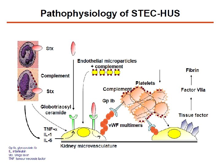 STEC-HÜS Hastalarının Klinik Tablosu a. HÜS Hastalarınınkine Benzerdir • Komplemanı aktive eden bir enfeksiyon sonucunda ortaya çıkar. • STEC-HÜS’ün nedeni Escherichia coli / Shigella tarafından üretilen Shiga toksindir. • Shiga toksin hem komplemanı direkt olarak aktive eder (alternatif yol) hem de komplemanın normal regülasyonu (kompleman faktör H’a bağlanarak) ile etkileşime girer. • Shiga toksin endotel hücrelerine zarar vererek trombositlerin aktivasyonuna neden olur. • Trombosit aktivasyonu ve endotel hasarı, küçük damarlarda çok sayıda trombüs oluşumuna, enflamasyon ve oklüzyonla karakterize sistemik TMA’ya neden olur.