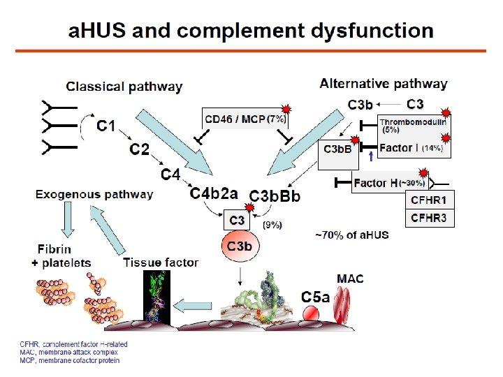 a. HÜS’ün Patolojisinin Altta Yatan Nedeni Kontrolsüz Kompleman Aktivasyonudur 1 -3 Endotelde şişme ve bozulma Kronik kontrolsüz kompleman aktivasyonu Trombosit aktivasyonu Lökosit aktivasyonu Trombositlerin tükenmesi Mekanik hemoliz (Şistositler) Endotel aktivasyonu Trombosit agregasyonu Kan Pıhtısı Enflamasyon Oklüzyon İskemi Hipoksi a. HÜS, atipik Hemolitik Üremik Sendrom 1. Hirt-Minkowski P et al. Nephron Clin Pract 2010; 114: c 219 -35; 2. Barbour T et al. Nephrol Dial Transplant 2012; 27: 2673 -85; 3. Noris M, Remuzzi G. N Engl J Med 2009; 361: 1676 -87