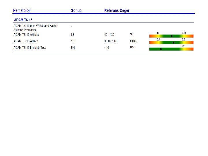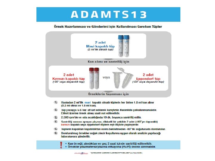 ADAMTS 13 Tanı Testi • ADAMTS 13 aktivitesi – Normal aktivite %60–%150 arasındadır – Konjenital ya da edinsel TMA’nın nedeninin şiddetli ADAMTS 13 yetersizliği olduğunu doğrulamak için, aktivite <%10 olmalıdır. – >%10 aktivite düzeyi, ADAMTS 13 yetersizliğinin TMA’nın nedeni olmadığına işaret eder • ADAMTS 13 inhibitörleri – Plazmada ADAMTS 13 antikorlarının tespit edilmesi hastalığın konjenital değil edinsel olduğunun göstergesidir. – ADAMTS 13 testinin sonuçları son derece hızlı bir şekilde alınmalıdır (24 saat içerisinde) – ADAMTS 13 testinin sonuçları beklenirken, s. Cr <150– 200 μmol/l ya da trombosit sayısının <30, 000/mm 3 ölçülmesi halinde şiddetli ADAMTS 13 yetersizliği düşünülebilir.