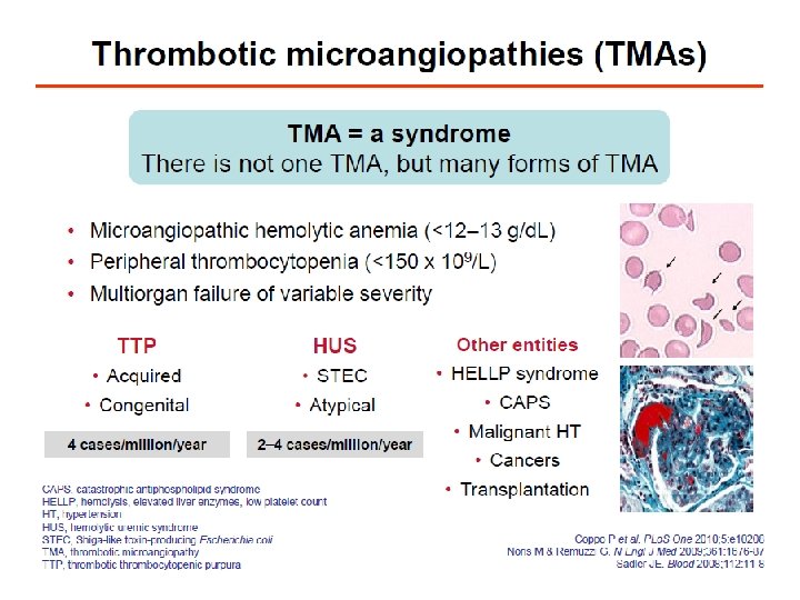 TMA • Non-immün hemolitik anemi • Periferik kan yaymasında fragmante hücreler • Trombositopeni TMA → İkincil nedenleri ekarte et TTP HUS Cataland SR, Wu HM. How I treat: The clinical differentiation and initial treatment of adult patients with atypical hemolytic uremic syndrome. Blood. 2014 Apr 17; 123(16): 2478 -84. doi: 10. 1182/blood-2013 -11 -516237. Epub 2014 Mar 5.