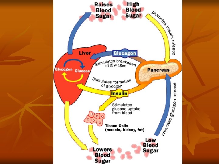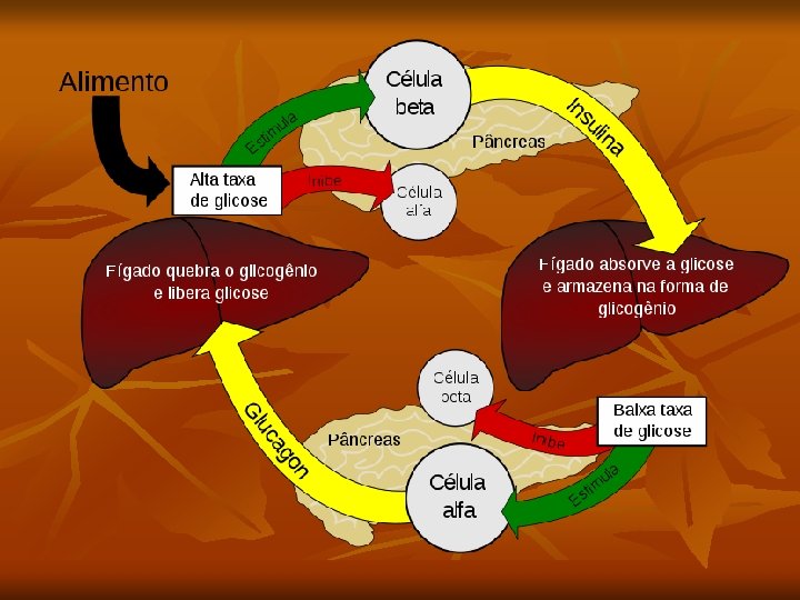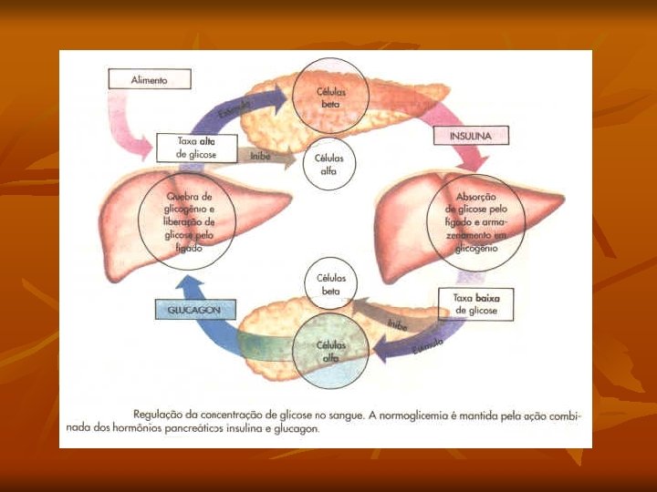 P NCREAS n n INSULINA – aumenta a captação de glicose Estimula o armazenamento da biomoléculas. GLUCAGON – estimula a mobilização dos estoques de glicose (glicogenólise) e de lipídeos; SOMATOSTATINA