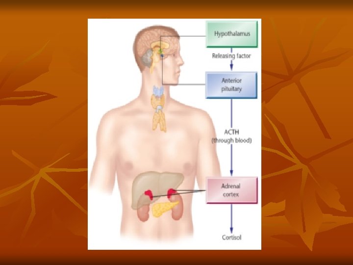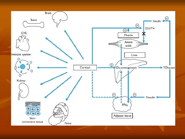 SUPRA-RENAIS n n n CORTISOL -Importante hormônio catabólico; Aumenta o catabolismo protéico, com mobilização de Aas – ativa a gliconeogênese; Estímulo a mobilização dos ac. Graxos; Estímulo das enzimas hepáticas a síntese de glicose (neoglicogenese) Bloqueia a entrada de glicose nos tecidos (manutenção da glicemia)-favorece a lipólise