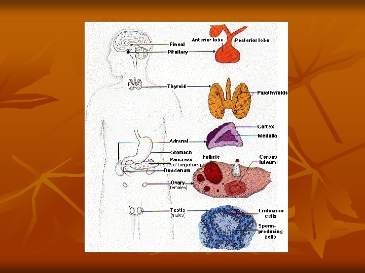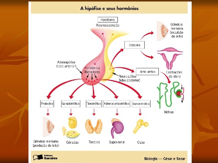 REGULAÇÃO E AÇÃO DOS HORMÔNIOS n n n HIPOTÁLAMO orienta os estímulos recebidos e está conectada a HIPÓFISE; A resposta hipofisária atinge uma grande diversidade de glândulas; HIPÓFISE ----- GL NDULA MESTRA -----ALVOS PRIMÁRIOS E SECUNDÁRIOS ------EFEITO FISIOLÓGICO ------ FEEDBACK