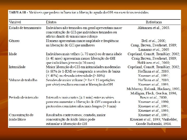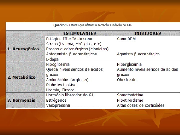 HORMÔNIO DO CRESCIMENTO n n Estimula a síntese proteica e o crescimento; Aumenta a neoglicogênese hepática; Aumenta a lipólise nos adipócitos, por bloqueio da glicose; No exercício , aumenta em condicões mais anaeróbicas e com carga;