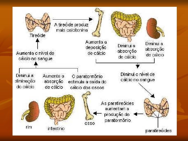 TIREÓIDE n n n CALCITONINA Contribui para o cálcio plasmático e absorcão óssea; O principal regulador – PARATORMÔNIO, sintetizado pelas paratireóides, com estímulo ósseo, absorção renal e conversão da vit. D do trato gastrointestinal;