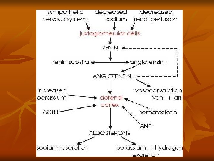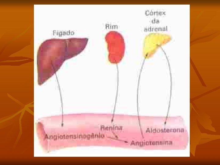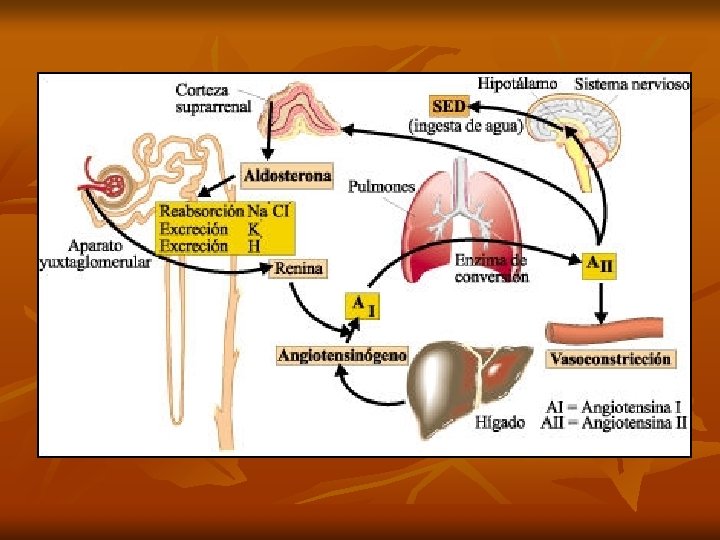 n n n A aldosterona regula o equilíbrio entre o Na e o K. Aumenta com o exercício extenuante, ligada ao sistema RENINA-ANGIOTENSINA O mecanismo inicia com a elevação do K. Participa da indução da sede;