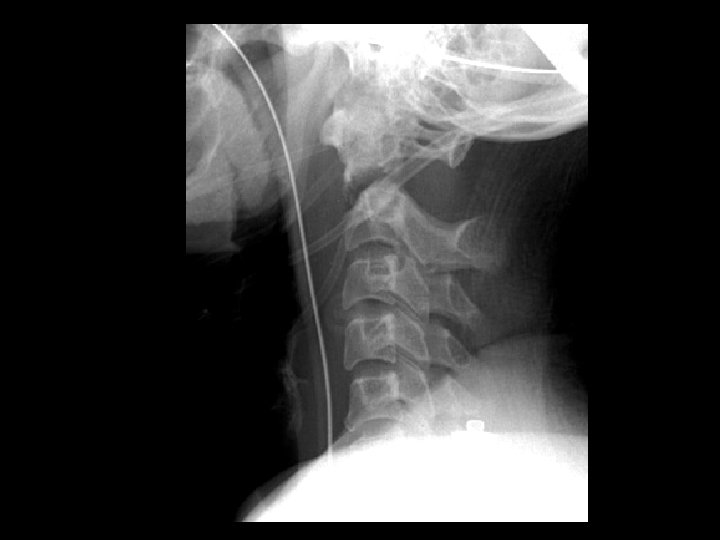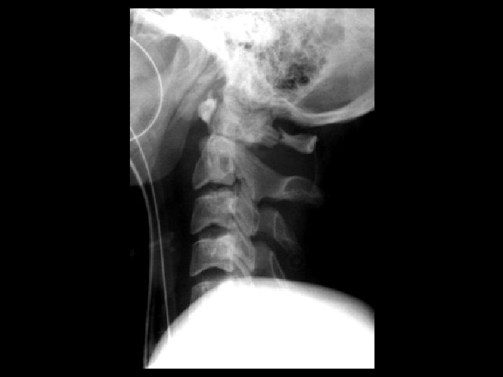 Atlanto-occipital dislocation • Findings: – anterior and superior displacement of occipital condyles in relation to C 1 – pre-vertebral soft tissue swelling – mechanism: hyperflexion or hyperextension – UNSTABLE