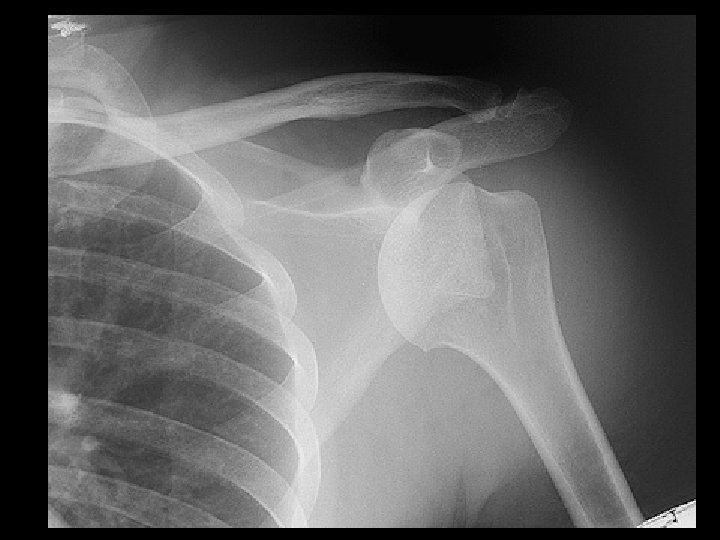 Anterior shoulder dislocation • Findings: – inferomedial, subcoracoid position of the humeral head – too much overlap of humeral head and glenoid – axillary view shows Hill Sachs - Bankhart configuration • ddx: – NONE! – This is an Aunt Minnie!