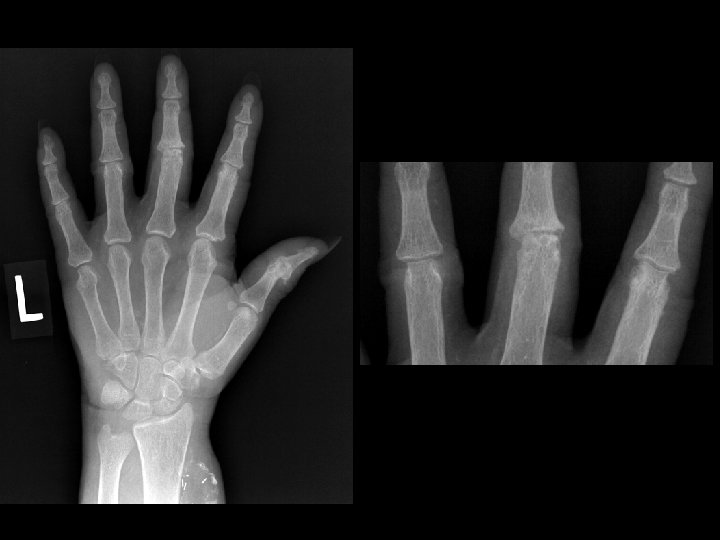 Synovial chondromatosis • Findings: – Smoothly marginated erosions on both sides of the 4 th MCP joint – Soft tissue mass causing narrowing of the 4 th MC – Single joint involvement • ddx: – Rheumatoid – PVNS