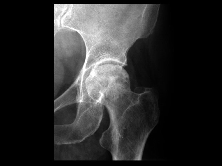 Femoral Head AVN with collapse • Findings: – Mixed sclerotic and lytic appearance of the femoral head – 2 mm collapse of the superior articular surface – Joint space still preserved • ddx: – NONE! – This is an Aunt Minnie!