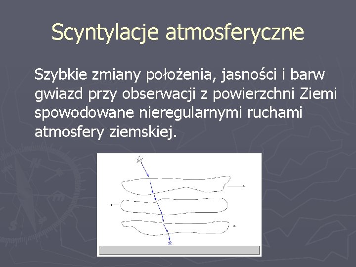 Scyntylacje atmosferyczne Szybkie zmiany położenia, jasności i barw gwiazd przy obserwacji z powierzchni Ziemi spowodowane nieregularnymi ruchami atmosfery ziemskiej.