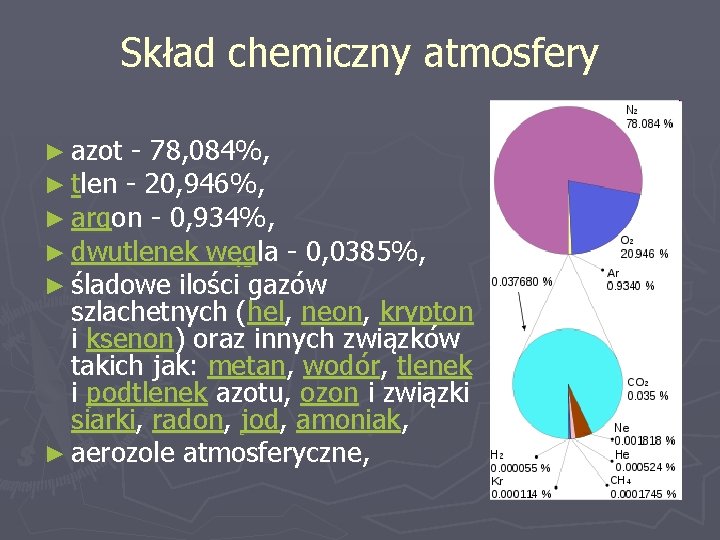 Skład chemiczny atmosfery ► azot - 78, 084%, ► tlen - 20, 946%, ► argon - 0, 934%, ► dwutlenek węgla - 0, 0385%, ► śladowe ilości gazów szlachetnych (hel, neon, krypton i ksenon) oraz innych związków takich jak: metan, wodór, tlenek i podtlenek azotu, ozon i związki siarki, radon, jod, amoniak, ► aerozole atmosferyczne,