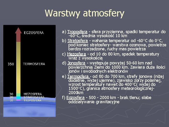 Warstwy atmosfery a) Troposfera - sfera przyziemna, spadki temperatur do -60°C, średnia wysokość 10 km b) Stratosfera - wahania temperatur od -60°C do 0°C, pod koniec stratosfery- warstwa ozonowa, powietrze bardzo rozrzedzone, ruchy mas powietrza c) Mezosfera - od 10 do 80 km, spadek temperatury wraz z wysokością d) Jonosfera - występuje powyżej 50 -60 km nad powierzchnią Ziemi do 1000 km. Zawiera duże ilości jonów i swobodnych elektronów e) Termosfera - od 80 do 700 km, strefy jonowe (niżej dodatnie, wyżej ujemne), zjawisko zorzy polarnej, wzrost temperatury nawet do 400°C( wyżej do 1500°C), granica atmosfery meteorologicznej 2000 km f) Egzosfera - 500 - 2000 km - brak tlenu; słabe oddziaływanie grawitacyjne