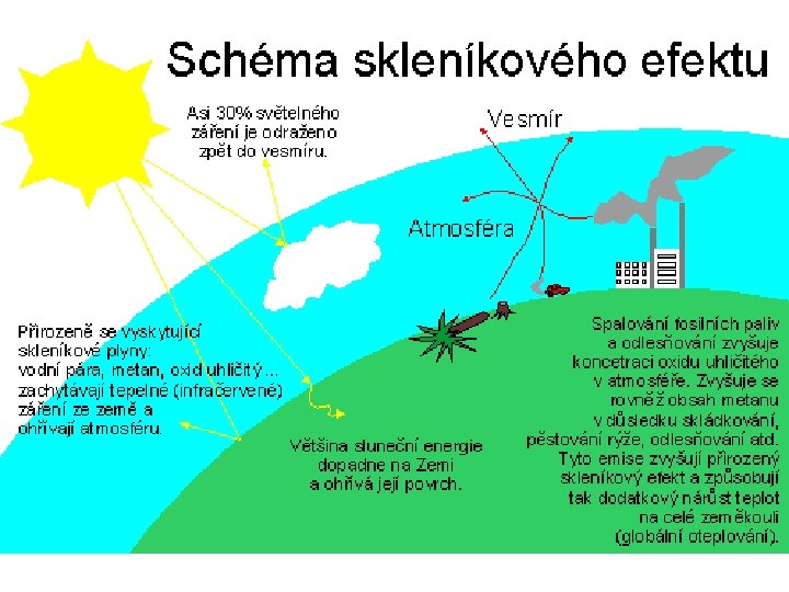 Skleníkový efekt - díky přítomnosti oxidu uhličitého (CO 2), vodních par a dalších skleníkových plynů existuje tzv. skleníkový efekt - atmosféra propouští krátkovlnné záření Slunce, odražené dlouhovlnné záření je atmosférou zachycováno → kumulace záření, tepla - je přirozený x vlivem působení člověka roste podíl CO 2 v atmosféře → zvětšování skleníkového efektu → zvyšování teploty na Zemi • měření teplotního rozložení – využití družic – rychlé a přesné zjištění stavu
