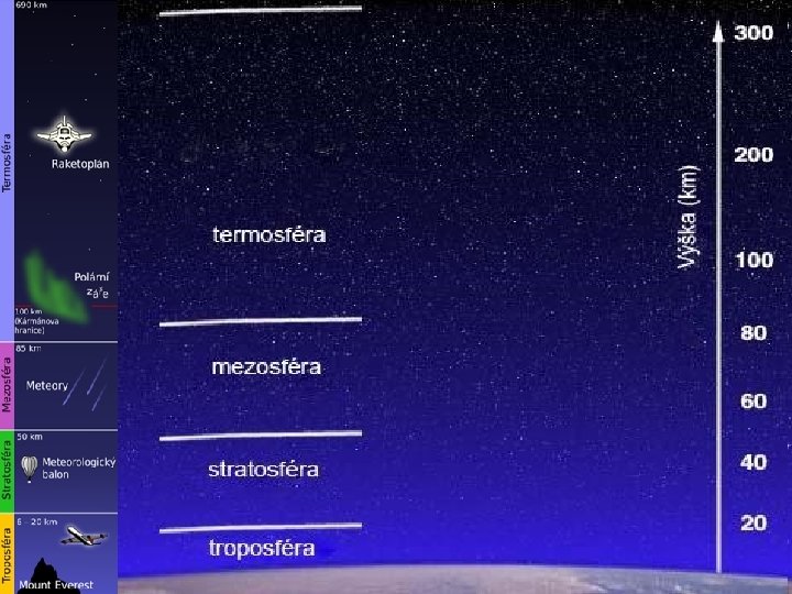 Vrstvy atmosféry Teplota a složení zemské atmosféry se liší podle nadmořské výšky, konkrétní úměra mezi výškou a teplotou se však rovněž mění s výškou. Podle tohoto vztahu tedy dělíme zemskou atmosféru na tyto vrstvy: