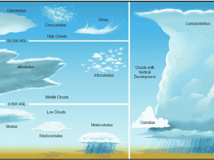 §Middle clouds can contain ice crystals and/or water droplets and may occasionally be associated with some light precipitation. üAltocumulus have distinct cloud elements and are either in a patchy, scattered distribution or can appear in linear bands. üAltostratus have a more uniform and diffuse coverage where it is difficult to detect individual elements or features.