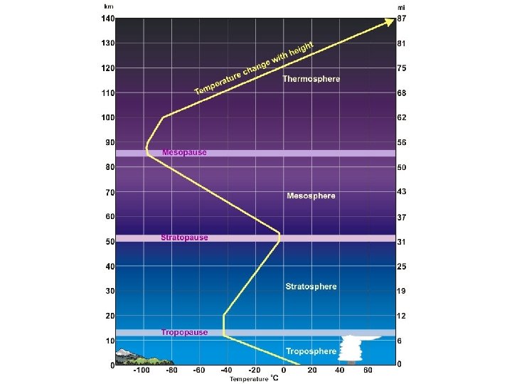 Stratosphere The stratosphere extends from the about 12 km to about 51 km Almost no weather occurrence. Contains the Ozone Layer (A thin layer of Ozone) Temperature increases with height due to increased absorption of ultraviolet radiation by the ozone layer. • Commercial airliners typically cruise at altitudes of 30, 000– 39, 000 ft in the lower reaches of the stratosphere. • While the temperature may be − 76 °F at the troposphere, the top of the stratosphere is much warmer, and may be near freezing. • • •