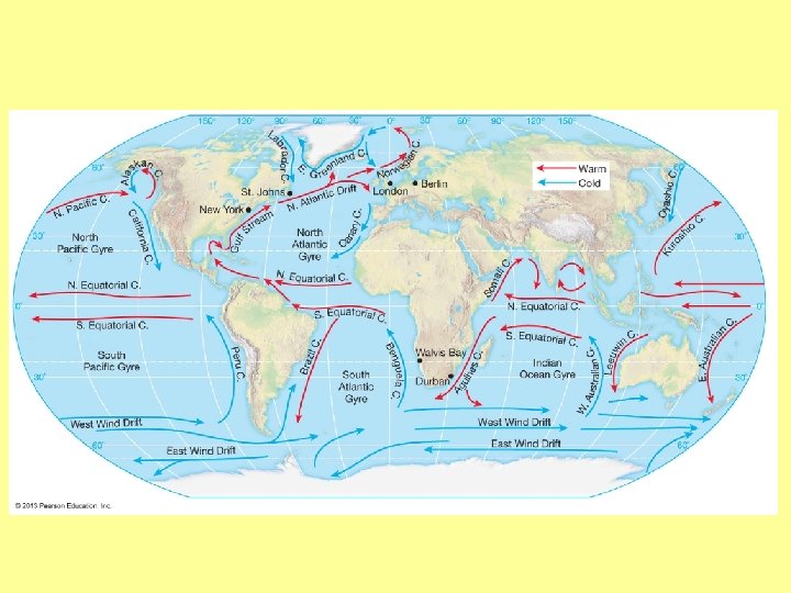 How do the distribute energy? • Sun hits the equator at 90 o meaning concentrated rays. • Oceans store this insolation and can transfer it. Water expands when heated and is pushed north and south. • Cold dense polar water sinks (labrador currents), then spreads towards the equator where it pushes up the less dense warmer water which moves off towards the polar areas.