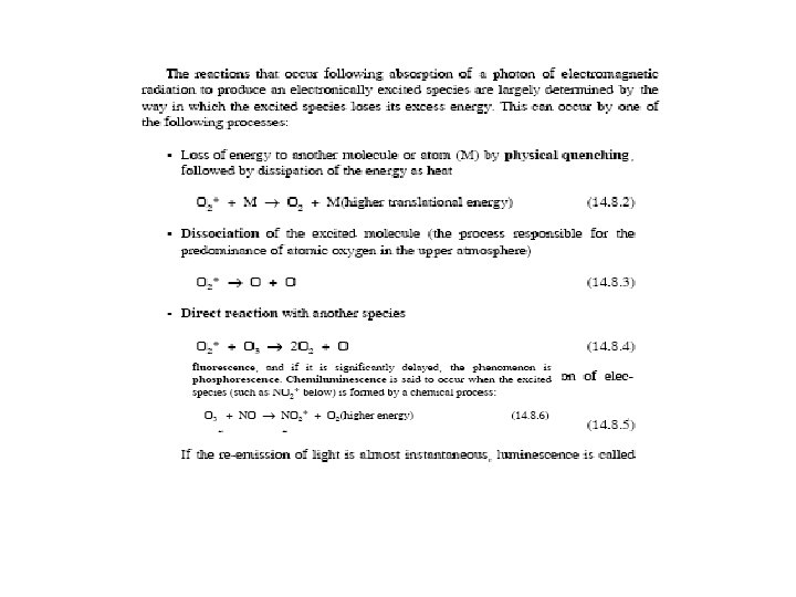 14. 8 chemical and photochemical reactions in the atmosphere Atmospheric chemistry involves The unpolluted atmosphere The highly polluted atmosphere The in between range Classification of Gaseous atmospheric chemical species 1 Inorganic oxides: CO, CO 2, NO, SO 2 2 Oxidants: O 3, H 2 O 2, HO. , H 2 O. , ROO. , NO 3. 3 Reductants: CO, SO 2, H 2 S 4 Organics reductants: CH 4, alkanes, alkenes, and aryl compounds oxidized: carbonyls, organic nitrates