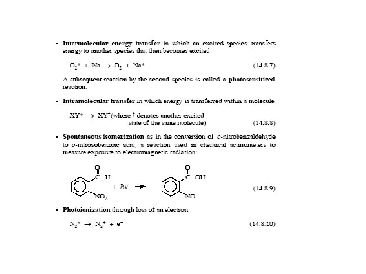 5 photochemical active species: NO 2, Formaldehydes 6 Acids H 2 SO 4 7 Bases: NH 3 8 Salts: NH 4 HSO 4 9 unstable reactive species: electronically excited species, NO 2, HO. Photochemical process NO 2 is one of the most photochemically active species found in a polluted atmosphere. And is essential participant in the smog formation process. NO 2 + hν → NO 2* This type of active species is producing of electronically excited molecules Other two types of reactive unstable species are Free radicals and Ions