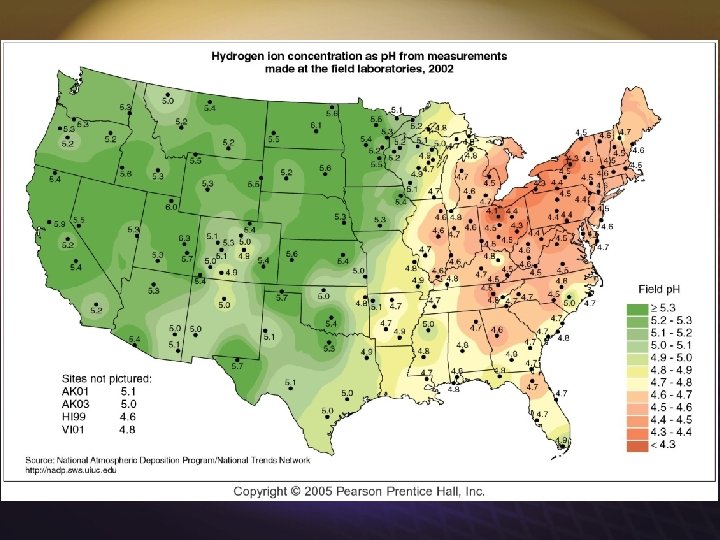 Effects of Acid Deposition s Alteration of plant and animal reproduction s Leaching of other toxic elements, e. g. , aluminum s Eutrophic to oligotrophic conditions s Total loss of biota from aquatic ecosystems s Alterations of food chains