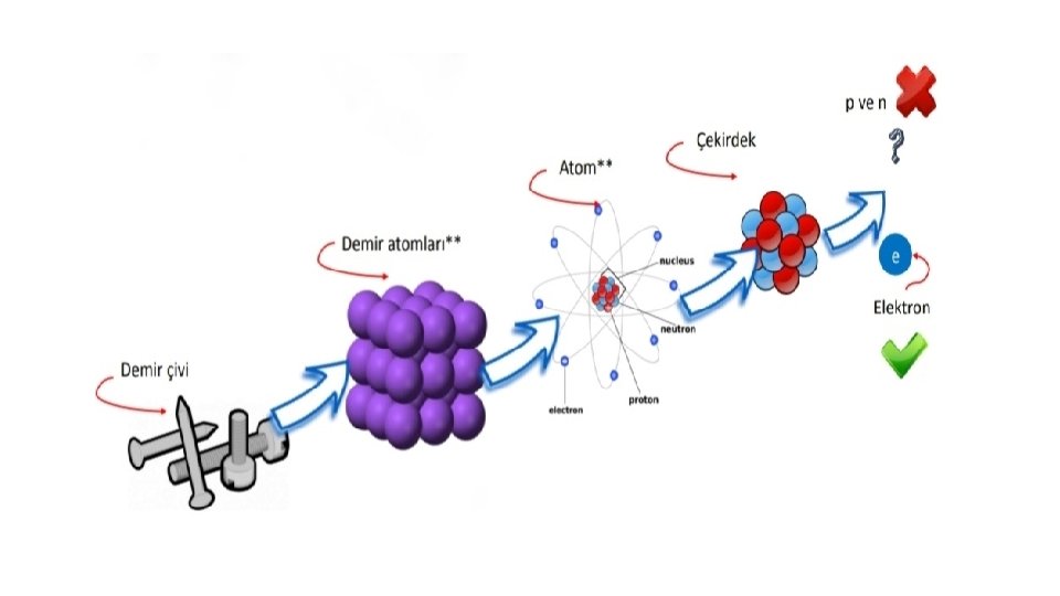 ATOM VE ÖTESI • Dalton atom modelinde ifade edildiği gibi atomun en küçük parça olamadığı içinde elektron, proton ve nötron gibi parçacıklar bulunduğu ortaya çıktı. • 1897 yılında Thomson katot ışınları deneyi ile elektronun varlığını belirledi. • 1911 yılında Rutherford çekirdeği ve protonu buldu. • 1932 yılında Chadwick nötronları buldu.