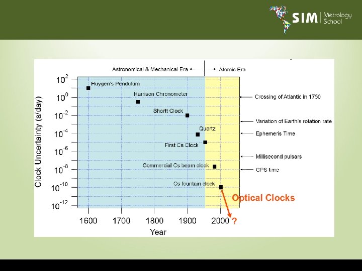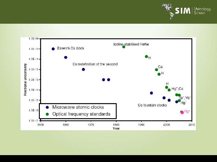 Electromagnetic radiation Microwaves 1. 6 GHz Pasive Active Rubidium Cesium 6. 8 GHz 9. 2 GHz Current definition of the second Hydrogen visible Magnetic selection Optical pumping Cold atoms Optcial clocks 1015 Hz - 1015 Hz Hg+, Yb+, Sr+, In+, Al+, Ca, Sr, Yb, Sr, Hg